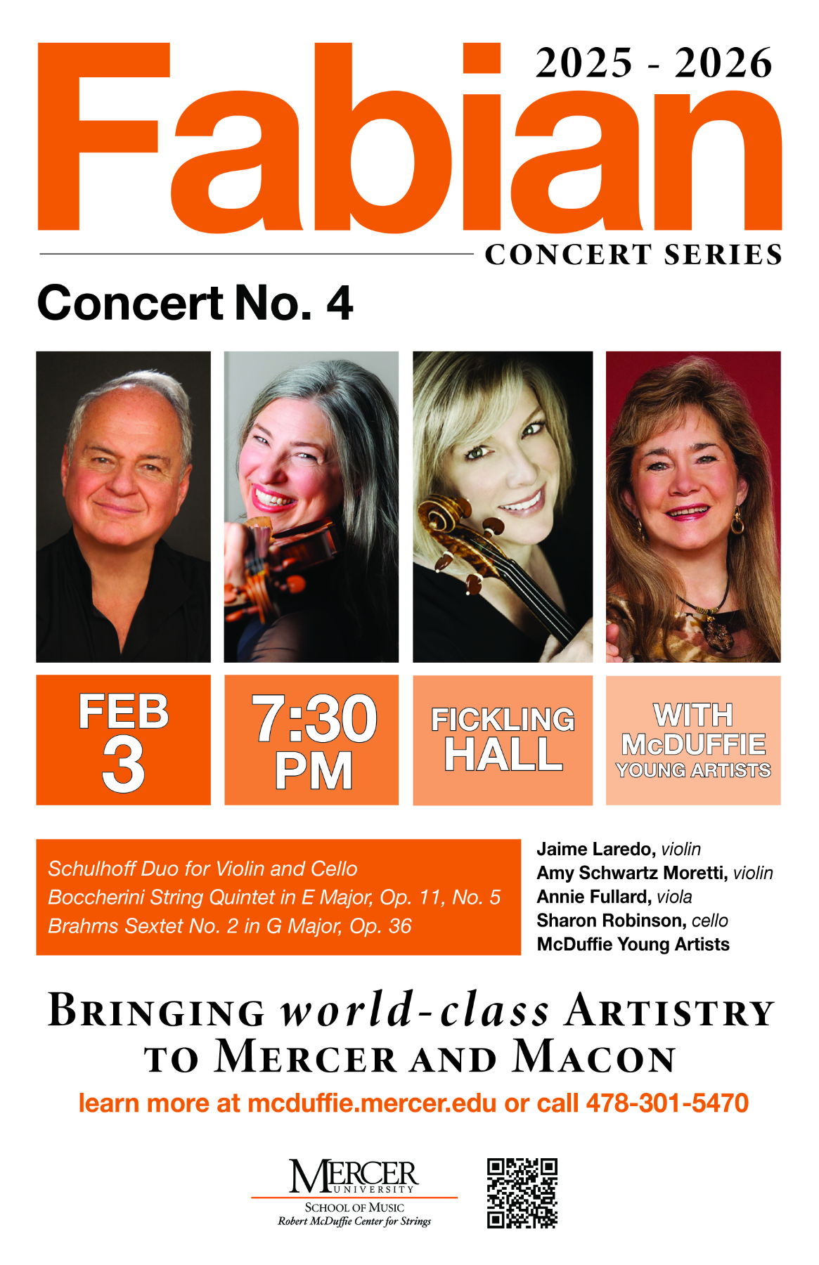 MACON, Ga. — Internationally acclaimed artists perform alongside Mercer University students and faculty in the Fabian Concert Series, showcasing the elegance of chamber music in a program curated by Amy Schwartz Moretti, director of the Robert McDuffie Center for Strings.